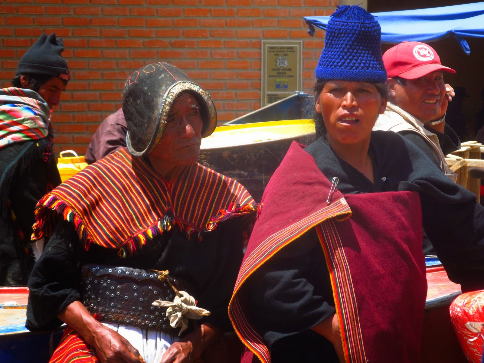 The main plaza in Tarabuco is quite different to the quiet one of my previous midweek visit. Today a mob of people and the streets filled with the Roman red shawls of the Yampara people. The men wear thick studded leather belts across their entire midriff, curved black hats like helmets. The miners, proudly wear shining golden miner’s helmets, shaped like a firefighter’s helmet. The traditional amongst them wear short square white trousers reminding me of those from Atitlan in Guatemala. Women dotted around the plaza, their knees on the cobbles, bent over and weaving at “telars” staked down between the setts. They wear tall top hats, decorated in front with a rectangle of coloured beads with more white beads dangling down over the brim like a waterfall, the hats often turned to an angle, a little bit ghetto, a bit of attitude…with a fluffy pompom floating on a stick above it. I’d bought some stuffed potatoes from a women on this corner the last time I was here, but I can’t stomach anything today. It’s nice here, but more set up for us tourists and I’m keen to see the more genuine goings on so I push on away from the square in search of the real market. It’s not so far but oddly there are fewer tourists here, no more woven purses and toy llamas, just potatoes, onions, carrots, tools, batteries, padlocks, a man carrying a tyre on his shoulder and another man walking out of town shouldering a gas bottle. Trucks park up, rear-end facing in, empty now, waiting for later when people will load their sacks of veg or large cloth bundles of purchases and pile in to head back into the bare looking countryside.